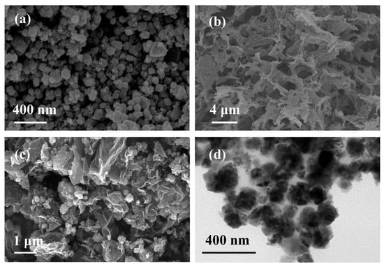 (a–c) SEM images of MnFe2O4, BGA, and MnFe2O4/BGA, respectively, and (d) a TEM image of MnFe2O4/BGA.