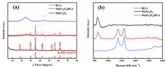 The (a) XRD patterns and (b) Raman spectra of MnFe2O4, BGA and MnFe2O4/BGA.