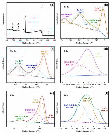 (a) The survey and deconvoluted (b–f) Fe 2p, Mn 2p, B 1s, C 1s, and O 1s XPS spectra of the MnFe2O4/BGA composite.