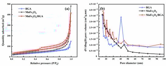 In their N2 adsorption–desorption isotherms shown in Figure 4a, BGA, MnFe2O4, and MnFe2O4/BGA demonstrate typical IV isotherms with a type H3 hysteresis loop, indicative of the random distribution of pores and the interconnection of pores. Moreover, the calculated specific surface area of MnFe2O4/BGA (142.425 m2 g−1) is much larger than that of BGA (108.874 m2 g−1) or pure MnFe2O4 (79.068 m2 g−1). Barrett–Joyner–Halenda (BJH) analyses shown in Figure 4b reveal that the MnFe2O4/BGA composite is of mesoporous structure with pore size mainly distributed around 15.66 nm and total pore volume of 0.594 cm3 g−1. In comparison with that of BGA, the average pore size of MnFe2O4/BGA is decreased to some extent, which might be a result of the interactions between MnFe2O4 nanoparticles and BGA sheets. The large specific surface area of MnFe2O4/BGA might promote the adsorption of contaminants and offer more reactive sites to accelerate the generation of free radicals [].