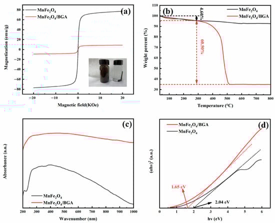 (a) The magnetic hysteresis loop of MnFe2O4 and MnFe2O4/BGA, the picture of MnFe2O4/BGA adsorbed by a magnet; (b) TG curve of MnFe2O4 and MnFe2O4/BGA; (c) UV-Vis-diffuse spectra; and (d) the (αhν)2 versus hν curves of BGA, MnFe2O4, and MnFe2O4/BGA.
