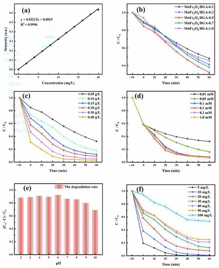 (a) The calibration curve of TC concentration; (b) MnFe2O4/BGA-n; (c) MnFe2O4/BGA dosage; (d) PMS dosage; (e) initial pH; and (f) initial concentration of TC dependences of the photocatalytic degradation of TC.
