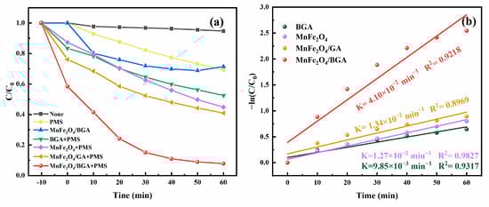 To highlight the outstanding degradation ability of the PMS+MnFe2O4/BGA system towards TC, seven comparative experiments were carried out under the optimized conditions, i.e., PMS dosage 0.1 mmol L−1, catalyst dosage 0.20 g L−1, pH = 6, and initial TC concentration 20 mg L−1. It can be seen from Figure 7a that the TC removal ratios reach 5.24%,30.73%, 28.56%, 47.53%, 55.14%, 59.03%, and 92.15%, respectively, in the seven designed systems. It is obvious that PMS or MnFe2O4/BGA alone demonstrates very limited degradation capacity towards TC in water and that BGA or MnFe2O4 could not degrade TC efficiently in the presence of PMS. In contrast, the MnFe2O4/BGA shows the most effective removal of TC in the presence of PMS. It should be noted that the catalytic performance of the MnFe2O4/BGA catalyst is significantly better than that of the MnFe2O4/GA catalyst, confirming the importance of BGA. As electron-deficient centers, the doped B atoms in BGA could trap photogenerated electrons, which is beneficial for the transfer and separation of photogenerated carriers. Moreover, the electrons trapped by the B atom, as well as the structural defects caused by B doping, are the reaction sites for TC degradation []. In addition, BGA also plays multiple roles in the adsorption of TC, extending visible light absorption and suppressing the agglomeration of MnFe2O4 nanoparticles. As indicated in Figure 7b, among the seven comparative experiments, MnFe2O4/BGA also is of the highest rate constant (4.1 × 10−2 min−1), which is larger than the sum of that of MnFe2O4 (1.27 × 10−2 min−1) and that of BGA (9.85 × 10−3 min−1). Therefore, it is assumed that a synergistic effect is established between MnFe2O4 and BGA, which is responsible for the greatly enhanced photocatalytic activity of the MnFe2O4/BGA composite catalyst.
