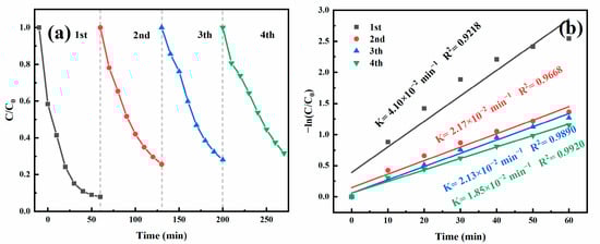 (a) Reusability of the MnFe2O4/BGA composite catalyst in 4 successive cycles and (b) corresponding pseudo-first-order kinetic curves.