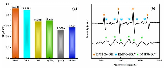 The scavenging assay was performed to evaluate the reactive oxidation species (ROS) in the photocatalysis of TC on MnFe2O4/BGA, AgNO3, AO, TBA, phenol, and p-BQ were applied as scavengers for quenching e−, h+, •OH, SO4•− and O2•−, respectively. It can be seen from Figure 9a that the main active species in the catalytic degradation of TC are O2• and SO4•−. On the other hand, DMPO was used as a spin-trapping agent for the radicals of O2•−, •OH and SO4•− in the reaction system. As shown in Figure 9b, the electron spins of DMPO-O2•−, DMPO-•OH, and DMPO-SO4•− were clearly detectable, offering another support to the existence of O2•− oxidation reaction in addition to the conventional ones of •OH and SO4•− free radicals.