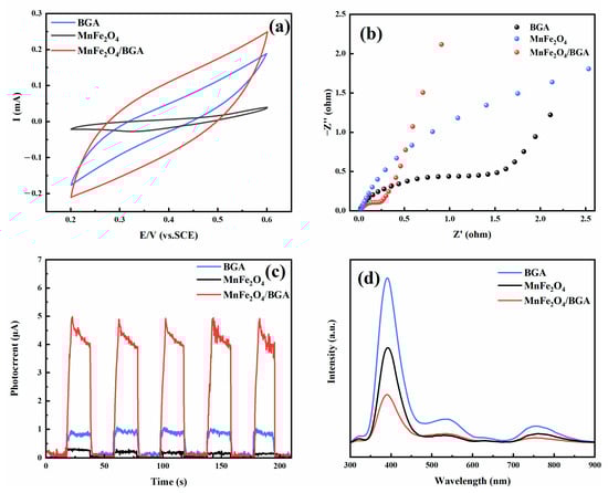 Shown in Figure 10a are the cyclic voltammetry curves of BGA, MnFe2O4 and MnFe2O4/BGA in a potential window of 0.2–0.6 V at a scanning rate of 20 mV·s−1. It is obvious that the box-like area of MnFe2O4/BGA is much larger than that of BGA or MnFe2O4, indicating that MnFe2O4/BGA demonstrates a more efficient redox reaction than BGA or MnFe2O4. From the Nyquist diagram of BGA, MnFe2O4, and MnFe2O4/BGA shown in Figure 10b, it can be seen that the arc radius of the Nyquist curve for MnFe2O4/BGA is smaller than that for MnFe2O4 or BGA, which indicates a more effective separation of photogenerated e−-h+ pairs and a higher efficiency of charge immigration across the electrode/electrolyte interface. Simultaneously, the photocurrent responses of MnFe2O4, BGA and MnFe2O4/BGA were also investigated by transient photocurrent tests. It can be seen from Figure 10c that the photocurrent of MnFe2O4/BGA is much larger than the sum of those for MnFe2O4 and BGA, confirming the aforementioned synergistic effect established between MnFe2O4 and BGA. Displayed in Figure 10d are the photoluminescence spectra of MnFe2O4, BGA, and MnFe2O4/BGA, which were excited by a laser with a wavelength of 250 nm. The room temperature luminescence peaks are observed at 420, 532, and 750 nm, respectively, in all the samples. The symmetrical peak at 750 nm might be owing to the third-order diffraction of the optical grating inside the monochromator. In comparison, the peaks at 420 and 532 nm correspond to the transitions associated with MnFe2O4 and/or BGA, which result from the recombination of photogenerated electron-hole pairs and that of photogenerated holes with singly ionized oxygen vacancies [,], respectively. It is obvious that the photoluminescence of the MnFe2O4/BGA composite material is greatly reduced relative to those of MnFe2O4 and BGA. This reduction is most likely due to the quenching effect caused by the charge transfer from MnFe2O4 nanoparticles to the BGA sheet. Such charge transfer-led fluorescence quenching is indicative of the effective promotion of charge transfer and efficient suppression of the recombination of photogenerated electron-hole pairs [].
