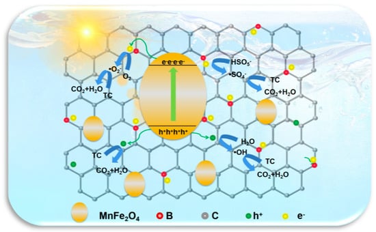 Based on the experimental results shown above, the photodegradation mechanism for the degradation of TC on MnFe2O4/BGA is proposed. As illustrated in Figure 11, MnFe2O4 nanoparticle and BGA sheets intimately contact each other to form type-I heterojunctions, owing to the chemical interaction between B doped in the sp2 networks of graphene and the oxygen on the surface of MnFe2O4 (B…O-Fe) as well as that between the unreduced oxygen in graphene and the Fe on the surface of MnFe2O4 (C-O…Fe-O) []. BGA and MnFe2O4 form heterojunctions, which create a built-in electric field at their interface to broaden light absorption spectral range, enhance charge separation, inhibit charge recombination and accelerate the kinetic process. The data shown in Figure 5, Figure 7 and Figure 9 offer strong support for the formation of type-I heterojunctions at the interface between BGA and MnFe2O4.