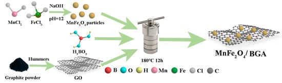As illustrated in Figure 12, MnFe2O4 was synthesized by the co-precipitation of MnCl2·4H2O and FeCl3·6H2O with a molar ratio of 1:2 at pH = 12 [], whereas graphene oxide (GO) was prepared from graphite powder by modified Hummers method []. The MnFe2O4/BGA composite was achieved through a hydrothermal procedure. A mixture of 140 mg GO, a certain amount of MnFe2O4 (the mass ratios of MnFe2O4/GO are 0.1, 0.3, 0.5, 0.7 and 1.0, respectively), 50 mL deionized water, 20 mL ethylene glycol, and 280 mg H3BO3 were mechanically stirred for 30 min and then transferred to a Teflon liner stainless steel autoclave. After hydrothermal treatment at 180 °C for 12 h, the product was immersed in an aqueous solution of ethanol (10%) for 12 h, followed in water for another 12 h, and finally subjected to a freeze-dried treatment for 48 h. Such obtained samples were named MnFe2O4/BGA-n (n = 0.1, 0.3, 0.5, 0.7, or 1.0) according to the mass ratio of MnFe2O4/GO. In this context, MnFe2O4/BGA refers to MnFe2O4/BGA-0.5 without a specific statement. The MnFe2O4/GA composite and BGA were synthesized by the same procedure without the addition of H3BO3 or MnFe2O4, respectively.