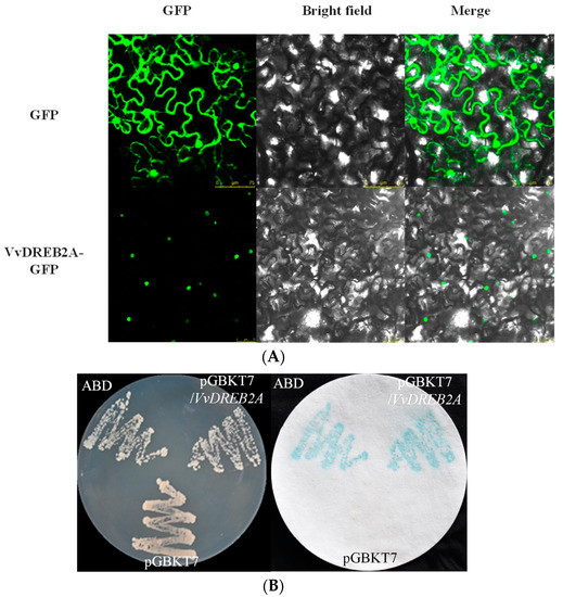 To identify the subcellular localization of VvDREB2A, the pSuper1300-VvDREB2A-GFP was constructed and transiently expressed in tobacco leaves. The results indicated that green fluorescence was only observed in the nucleus of the tobacco leaves (Figure 2A), implying that VvDREB2A was located in the nucleus.