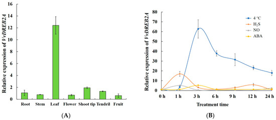 Further, the tissue culture seedlings of ‘Zuoyouhong’ were subjected to cold stress (4 °C) and cold-related signaling molecules, such as H2S, NO, and ABA, were determined. The results showed that 4 °C, H2S, NO, and ABA-induced VvDREB2A expression. The 4 °C and H2S treatments strongly induced VvDREB2A expression, which peaked at 3 h and 1 h, respectively (Figure 3B). These data indicate that VvDREB2A is induced by cold stress as well as signaling molecules related to cold stress.