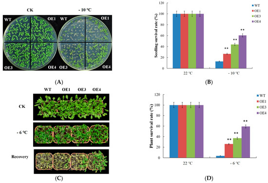 Arabidopsis treatment: 2-week-old Arabidopsis were treated at −10 °C for 1 h, and then cultured at 22 °C for 2–3 days to observe the phenotypes and collect the survival rate data; 4-week-old Arabidopsis were treated at 4 °C for 36 h, followed by the −6 °C dark treatment for 12 h, 4 °C treatment for 12 h, and then cultured at 22 °C for 3–4 days for phenotypic observations and collecting the survival rate data; 4-week-old Arabidopsis were treated at 4 °C for 24 h (chilling treatment), or at 4 °C for 36 h followed by −6 °C for 2 h (freezing treatment). Cell membrane permeability; the H2O2, O2−, and malondialdehyde (MDA) amounts; antioxidant enzyme activities;and cold response genes expression levels were detected. 4-week-old Arabidopsis were treated at 4 °C for 3 days (chilling treatment), or at 4 °C for 36 h followed by −6 °C for 2 h (freezing treatment). The galactinol, raffinose, and stachyose contents were detected.