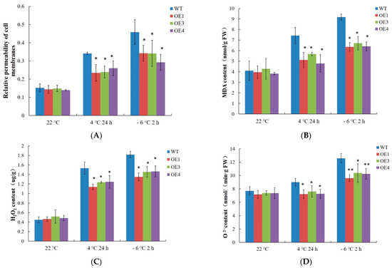 ROS accumulation in VvDREB2A-overexpressing Arabidopsis under cold stress Relative permeability of the cell membranes (A), MDA content (B), H2O2 content (C), and O2− content (D) in the leaves of transgenic Arabidopsis after being treated at 4 °C for 24 h or at −6 °C for 2 h. Asterisks show a significant difference between WT and transgenic lines (* p < 0.05; ** p < 0.01).