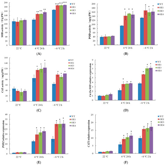 Effects of cold stress on antioxidant enzymes in VvDREB2A-overexpressing Arabidopsis. The activities of SOD (A), POD (B), and CAT (C), and the expression levels of Cu/Zn SOD (D), POD2 (E), and CAT1 (F) in transgenic Arabidopsis leaves treated at 4 °C for 24 h or at −6 °C for 2 h. Asterisks show significant differences between WT and transgenic lines (* p < 0.05; ** p < 0.01; *** p < 0.001).