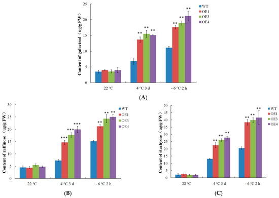 The RFOs are the second most abundant class of soluble sugars in higher plants after sucrose. As an important osmotic regulator in plants, RFOs play an important role in responses to abiotic stressors [4]. The synthesis of RFOs begins with raffinose, and the galactose groups on galactinol are transferred sequentially to produce raffinose and stachyose. The RFO contents were detected in this experiment. As shown in Figure 7, the WT and VvDREB2A-overexpressing Arabidopsis showed little difference in the levels of galactinol, raffinose, and stachyose at 22 °C. Nevertheless, the contents of galactinol, raffinose, and stachyose increased after the 4 °C and −6 °C treatments, and were significantly higher than the WT. As a result, VvDREB2A increases the cold tolerance of plants by increasing RFO contents.