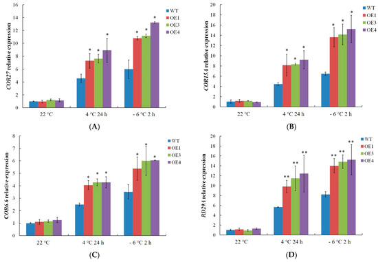 Measurement of cold-related gene expression in VvDREB2A-overexpressing lines after cold treatment COR27 expression (A), COR15A expression (B), COR6.6 expression (C), and RD29A expression (D) in transgenic Arabidopsis leaves after being treated at 4 °C for 24 h or at −6 °C for 2 h. Asterisks show significant differences between WT and transgenic lines (* p < 0.05; ** p < 0.01).