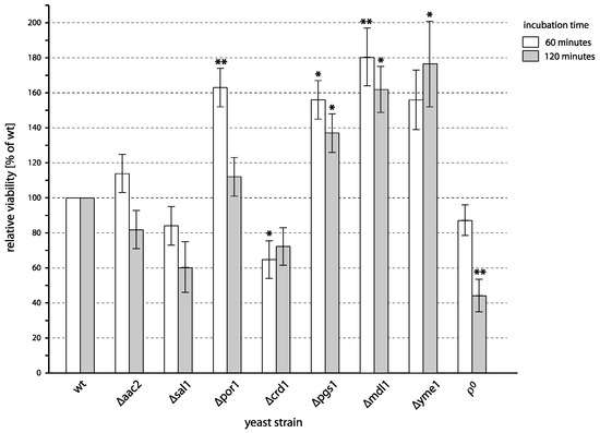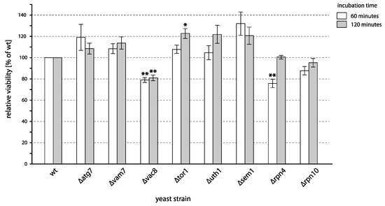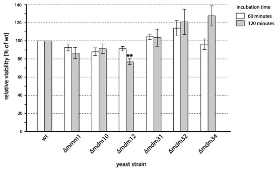 - Bandara, P.D.; Flattery-O′Brien, J.A.; Grant, C.M.; Dawes, I.W. Involvement of the Saccharomyces cerevisiae UTH1 gene in the oxidative-stress response. Curr. Genet. 1998, 34, 259–268. [Google Scholar] [CrossRef]
