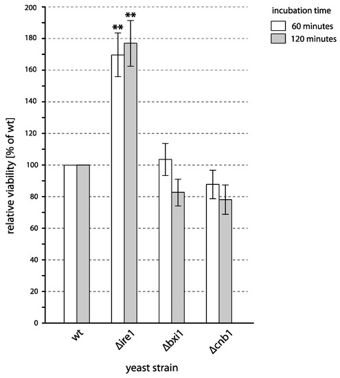 - Cebulski, J.; Malouin, J.; Pinches, N.; Cascio, V.; Austriaco, N. Yeast Bax inhibitor, Bxi1p, is an ER-localized protein that links the unfolded protein response and programmed cell death in Saccharomyces cerevisiae. PLoS ONE 2011, 6, e20882. [Google Scholar] [CrossRef] [PubMed]