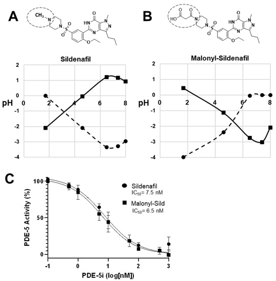 The predicted LogS and LogD at different pH values for each structure were calculated using tools available at Chemicalize.com. The PDE-5 inhibitory activity of sildenafil and malonyl-sildenafil was measured in vitro using a commercially available kit according to the manufacturer instructions (BPS Bioscience, San Diego, CA, USA). The assay was reproduced in three independent experiments with triplicate wells in each replicate. IC50 values were calculated using curve fitting functions in GraphPad Prism 9 (San Diego, CA, USA).