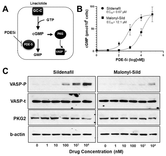 The lipophilic design of conventional PDE5is, such as sildenafil, tadalafil, and vardenafil, enables the entry into the circulation that is essential to reach the target tissues. To create a PDE5i with reduced systemic delivery, we sought to reduce lipophilicity by adding groups that carry a charge at physiological pH. To accomplish this, we substituted malonate for the methyl group on the piperazine ring of the prototypical PDE5i sildenafil. This structure (malonyl-sildenafil) is predicted to exhibit much higher solubility and reduced membrane permeability at physiological pH values (Figure 1A,B). An in vitro assay for PDE5i activity revealed an IC50 of 6.5 nM for malonyl-sildenafil that is similar to the parent compound (7.5 nM), indicating that the modification did not deleteriously affect the pharmacology (Figure 1C). We used a novel cell-based assay to assess the ability of the PDE5i to enter colon epithelial cells and activate cGMP signaling (Figure 2A). These results showed that malonyl-sildenafil was 18-fold less potent in terms of increasing cGMP levels in the cells than the parent compound based upon EC50 (Figure 2B). These observations were supported by a highly sensitive assay for the activation of cGMP-dependent protein kinase (Figure 2C).
