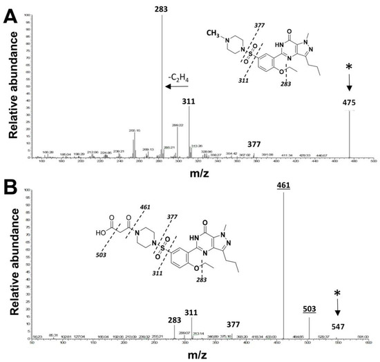 MS/MS Spectra for sildenafil and malonyl-sildenafil. Ion fragment patterns for sildenafil (A) and malonyl-sildenafil (B). Proposed peak identification is illustrated by the dashed lines on the inset structure diagrams. The enlarged bold text indicates common ion peaks between the two compounds, and the asterisk marks the parent compound. The underlined peaks in panel (B) indicate unique ions generated by the malonyl group.