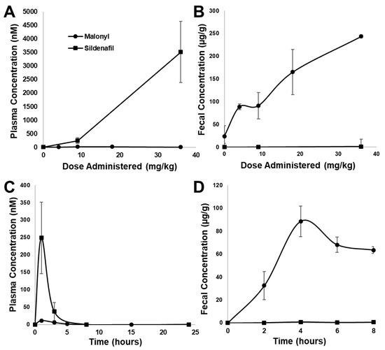 Pharmacokinetic analysis of malonyl-sildenafil in mice. Increasing doses of malonyl-sildenafil (circles) or sildenafil (squares) were administered to mice by gavage. LC-MS/MS was used to measure the compounds in plasma after 1 h (A), or in feces collected between 2–4 h (B). The compounds were also measured at different time points after administration of a single 9 mg/kg dose in plasma (C) and feces (D). Data are mean +/− SD (n = 6).