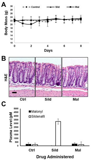 Malonyl-sildenafil is well tolerated in mice. Mice were maintained on water alone (Ctrl), sildenafil (Sild) or malonyl-sildenafil (Mal) dissolved in the drinking water for up to 8 days as indicated. (A) Body mass measurements, (B) representative H&E-stained sections of the distal colon, scale bar is 30 μ. (C) Detection of Sild or Mal in the plasma at 8 days. Data are mean +/− SD (n = 5).