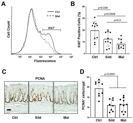 Mice (n = 6, males) were provided sildenafil or malonyl-sildenafil ad libitum in the drinking water dissolved at a concentration that delivered 9 mg/kg daily. Mice were weighed daily, and after at least 5 days of continuous consumption they were sacrificed, and the colon was dissected and processed for quantitation of proliferation by flow cytometry (proximal region) and by IHC (distal region). For flow cytometry, the epithelium was enriched by isolating crypts as described previously [45], followed by ethanol fixation and staining with phycoerythrin-conjugated anti-mouse Ki-67 antibodies according to the manufacturer instructions (Biolegend, San Diego, CA, USA). Flow cytometry was carried out using a BD Accuri C6 flow cytometer, and data were analyzed using FCS Express 7 software (De Novo Software, Pasadena, CA, USA). Processing the distal colon tissues for histology and immunohistochemistry was carried out as previously described. Briefly, tissues were fixed with 10% formaldehyde, embedded in paraffin blocks, and sectioned by the Augusta University histology core. The tissues were probed using antibodies to PCNA (1:100; Cell Signaling, Danvers, MA, USA). Visualization of PCNA antibodies was carried out using the ImmunoCruz ABC kit (Santa Cruz Biotechnology, Dallas, TX, USA). At least 10 different regions of the colon containing approximately 8 crypts per region were counted for each mouse. For both the flow-cytometer and immunohistochemistry approaches, each group (control, sildenafil, malonyl-sildenafil) contained 5 mice (male) and the experiment was reproduced in 2 independent replicates.