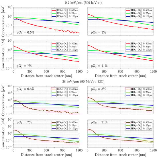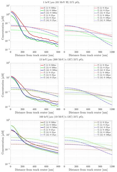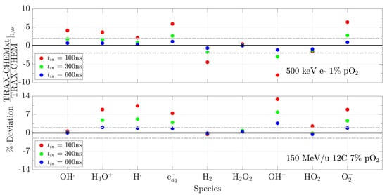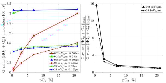 - Boscolo, D.; Krämer, M.; Fuss, M.C.; Durante, M.; Scifoni, E. Impact of target oxygenation on the chemical track evolution of ion and electron radiation. Int. J. Mol. Sci. 2020, 21, 424. [Google Scholar] [CrossRef] [PubMed]