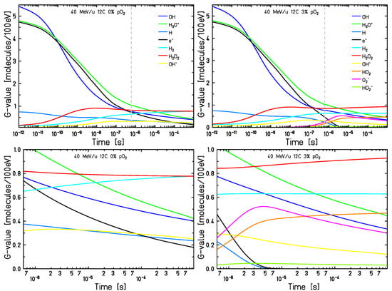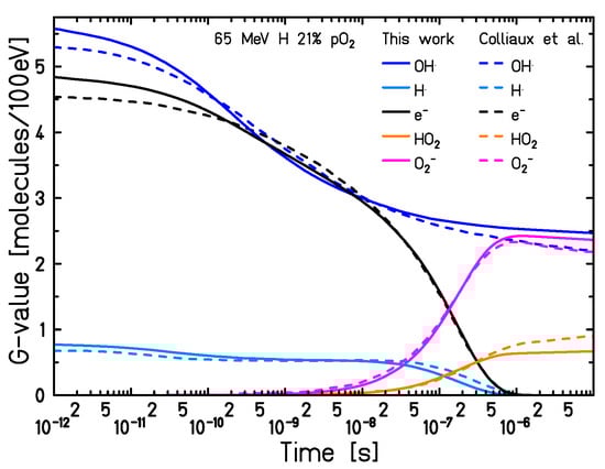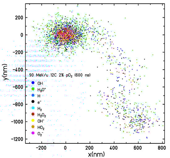 - Colliaux, A.; Gervais, B.; Rodriguez-Lafrasse, C.; Beuve, M. Simulation of ion-induced water radiolysis in different conditions of oxygenation. Nucl. Instruments Methods Phys. Res. Sect. B Beam Interact. Mater. Atoms 2015, 365, 596–605. [Google Scholar] [CrossRef]
