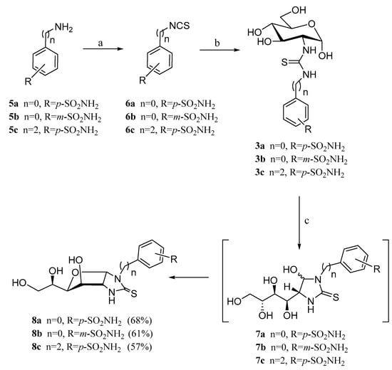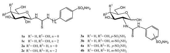 - Smaine, F.Z.; Winum, Y.J.; Montero, J.L.; Regainia, Z.; Vullo, D.; Scozzafava, A.; Supuran, C.T. Carbonic anhydrase inhibitors: Selective inhibition of the extracellular, tumor-associated isoforms IX and XII over isozymes I and II with glycosyl-thioureido-sulfonamides. Bioorg. Med. Chem. Lett. 2007, 17, 5096–5100. [Google Scholar] [CrossRef]