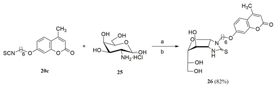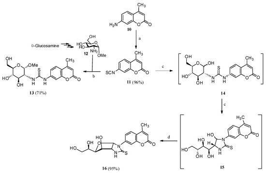 3.1.3. N-(Methyl 2-deoxy-α-d-Glucopyranosid-2-yl)-N′-(4-methyl-2′-oxo-2′H-chromen-7′-yl)thiourea (13)