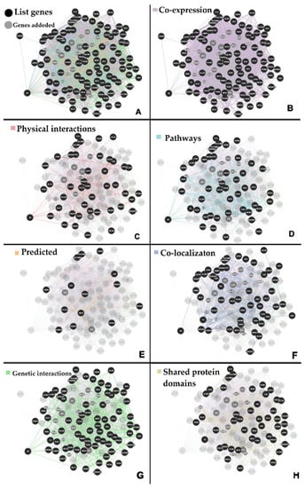 The gene-gene network presented a predominance of co-expression interactions (Figure 2B), followed by physical interactions (Figure 2C), molecular pathways (Figure 2D), predicted (Figure 2E), co-localization (Figure 2F), genetic interactions (Figure 2G), and shared protein domains (Figure 2H), respectively.