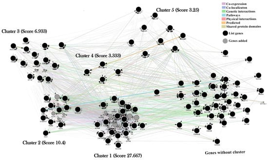 Overview of the five clusters obtained from the benzene gene-gene network using the MCODE software. Interaction network generated using GeneMANIA with 114 nodes (8 nodes expanded from a 96-gene list) and 2415 edges. All nodes are interconnected in a unique connected component, but 38 nodes do not belong to any cluster: Cluster 1: score = 27.667; Cluster 2: score = 10.4; Cluster 3: score = 6.933; Cluster 4: score = 3.333; and Cluster 5: score = 3.25. Nodes may represent biological elements, while the edges describe the nature of their relationships (co-expression; physical; pathways; predicted; co-localizaton; Genetic interactions; and shared protein domains).