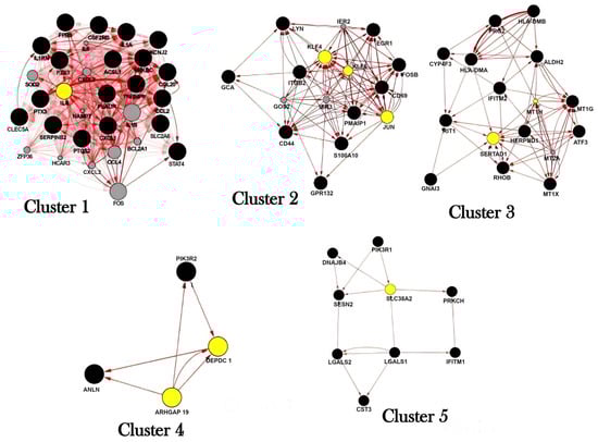 In the 3rd cluster, SERTAD1 and MT1H were identified as bottleneck nodes, with degree = 8.25, betweenness = 9.125, and eigenvector = 0.23. The 4th and 5th clusters are poorly interconnected, with central nodes in DEPDC1 and ARHGAP19 (degree = 3; betweenness = 0.5, and eigenvector = 0.49) and SLC38A2 (degree = 3; betweenness = 6.6, and eigenvector = 0.5), respectively (Figure 4).
