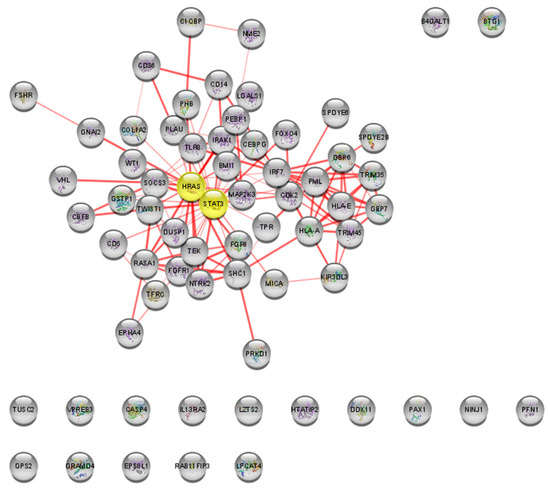 Dysregulation of HRAS and STAT3 pathways is frequently observed in several cancers [72,73,74]. Then altered HRAS protein is permanently activated within the cell. This overactive protein directs the cell to grow and divide in the absence of outside signals, leading to uncontrolled cell division and the formation of a tumor [2]. STAT3 regulates basic biological processes essential to tumorigenesis, including cell-cycle progression, apoptosis, tumor angiogenesis, invasion and metastasis, and tumor-cell evasion of the immune system [75].