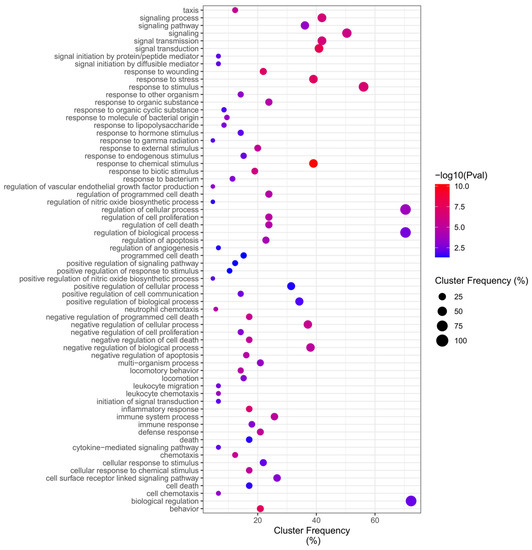 Of total 390 ontologies (Table S2) regulated by DEGs in the Benzene network, the GO (Gene Ontology) enrichment analysis identified up-frequency of Overrepresentation (adjusted p value < 0.05) in Biological Processes for “biological regulation”, “ regulation of the biological process”, and “regulation of the cellular process”, while down-frequency of Overrepresentation in Biological Processes related to the “positive regulation of nitric oxide biosynthetic process”, “regulation of vascular endothelial growth factor production”, “cytokine-mediated signaling pathway”, “leukocyte migration”, “leukocyte chemotaxis”, “cell chemotaxis”, and the most significant terms were “response to chemical stimulus”, indicating that the regulation of factors related to cellular locomotion, mainly leukocytes, plays a central role on the relationship between benzene and the development of leukemia (Figure 6).