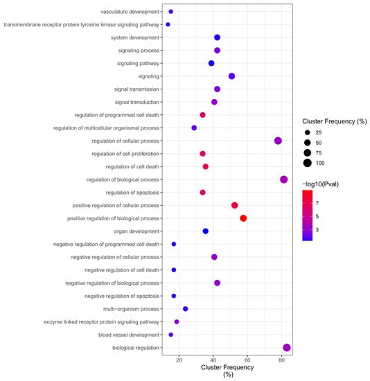 Of total 314 ontologies (Table S3) regulated by DEGs in the Malathion network, the GO enrichment analysis identified up-frequency of Overrepresentation (adjusted p value < 0.05) in Biological Processes for “regulation of cellular process”, “regulation of biological process”, and “biological regulation”, while down-frequency of Overrepresentation in Biological Processes related to “negative regulation of apoptosis”, “negative regulation of cell death”, “negative regulation of programmed cell death”, “transmembrane receptor protein tyrosine kinase signaling pathway”, and the most significant terms were “positive regulation of biological process”, indicating more general biological functions and cell death regulation (Figure 7).