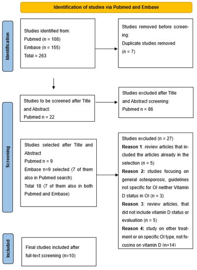 The literature revision was performed in the PubMed Central and Embase databases from January 2000 to October 2022. The eligibility criteria were: (1) studies evaluating the use of vitamin D measurement, status, and supplementation in individuals with a genetic or clinical diagnosis of OI; (2) including randomized and non-randomized studies, observational studies, case reports, and case series; (3) studies written in English or Italian; and (4) studies on pediatric and adult populations.