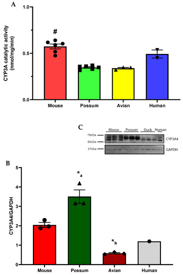 Basal hepatic CYP3A activity and protein levels in mice, possums, avians, and humans. Liver microsomes of each species were used to determine CYP3A activity via erythromycin N-demethylation. (A). Values are expressed in nmol/mg/min. Bars represent the mean ± SEM of n = 6 in triplicate (mouse and possum), n = 3 in triplicate (avian), and n = 2 in duplicate (pooled human liver microsomes). # Significantly different compared to possum and avian, p < 0.05. The protein content for CYP3A4 in liver microsomes from 4 species was determined by Western blotting (load of protein in each well was 2 µg). Hepatic microsomes were also subjected to CYP3A4 Western blotting and the scanning densitometry results were normalised to the housekeeping protein GAPDH. (B) The bars represent the mean ± SEM of optical density of n = 3 (except pooled human microsomes, n = 1). (*a) Significantly different compared to avians and (*b) significantly different compared to mice, p < 0.05. Representative Western blot (C).