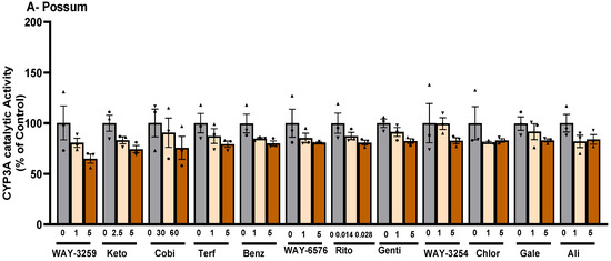 Ritonavir, on the other hand, showed reduced possum CYP3A catalytic activity (81% of the control) at 2-fold IC50 (0.28 µM), similar to that in the mouse (84% of the control), but not in humans (95% of the control). Ritonavir has been shown to reduce the metabolism of triazolam (a probe substrate of the CYP3A enzyme) by ~50% at a concentration of 0.014 µM in pooled human liver microsomes [33], but when ritonavir was tested for inhibitory activity at 0.014 µM using erythromycin as substrate, the activity was 95% of the control. In addition, cobicistat also showed a potential reduction in CYP3A activity in all test species: avian (63%), mouse (68%), possum (76%), and human (78%), mainly at 2-fold IC50 (or 0.06 µM). Hossain et al. [33] showed that cobicistat reduced the activity of triazolam metabolism by ~50% at 0.032 µM in pooled human liver microsomes. However, the present study found that cobicistat at 0.032 µM reduced erythromycin N-demethylation metabolism to ~78% of the control in pooled human liver microsomes. In addition, Tsujimoto et al. [34] reported that testosterone metabolism in pooled human liver microsomes was inhibited by 7-hydroxyflavone with an IC50 > 100 µM. However, our study with 7-hydroxyflavone at estimated IC50 and 2-fold IC50 values (or 100 and 200 µM) showed activity that was >83% of the control in possums, mice, avians, and humans.