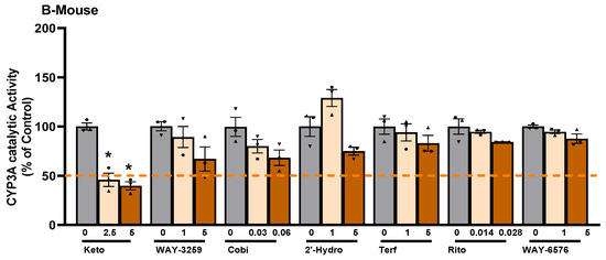 Effect of CYP450 inhibitor-based compounds on CYP3A catalytic activity in possum and mouse liver microsomes. Possum (A) and mouse (B) liver microsomes were incubated with 0.1 M phosphate buffer and CYP450 inhibitor-based compounds, and erythromycin N-demethylation was determined as an indicator of CYP3A inhibitory catalytic activity at estimated IC50 and 2-fold IC50 values. The dotted line shows the 50% control of CYP3A enzymes. The bars represent the mean ± SEM of n = 3 in duplicate in percent control. * Significantly different from the respective solvent control. Abbreviated compound names refer to WAY-325945 (WAY-3259), ketoconazole (Keto), cobicistat (Cobi), terfenadine (Terf), benzbromarone (Benz), WAY-657644 (WAY-6576), ritonavir (Rito), gentiopicroside (Genti), WAY-325412 (WAY-3254), chlorzoxazone (Chlor), galeterone (Gale), and alizarin (Ali).
