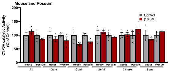 Effect of CYP450 inhibitor-based compounds on CYP3A catalytic activity in mouse and possum liver microsomes. Possum and mouse liver microsomes were incubated with 0.1 M phosphate buffer and CYP450 inhibitor-based compounds, and erythromycin N-demethylation was determined at a higher concentration (10 µM) as an indicator of CYP3A inhibitory catalytic activity. The bars represent the mean ± SEM of n = 3 in duplicate. Data were analysed using one-way ANOVA and none were statistically different compared to controls. Abbreviated compound names refer to alizarin (Ali), galeterone (Gale), cobicistat (Cobi), gentiopicroside (Genti), chlorzoxazone (Chlor), and benzbromarone (Benz).