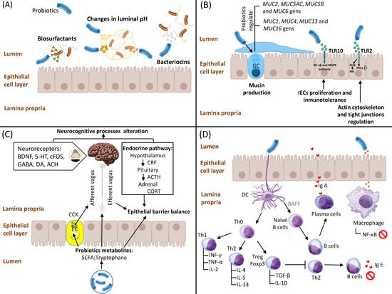 Mechanisms of action of probiotics. (A) Competitive adhesion and exclusion of potential pathogens. Probiotics create a hostile environment via changes in luminal pH as well as production of bacteriocins and biosurfactants. (B) Stimulation of intestinal epithelial cell (IEC) proliferation and epithelial barrier enhancement. Probiotics modulate IECs-dependent mucin production through regulation of several MUC genes. Moreover, probiotics enhance epithelial barrier and tight junctions due to their modulation of the NF-κB, MAPK PI3K/Akt and PKCs signalling pathways. (C) Interaction of probiotics and their metabolites (mainly short-chain fatty acids (SCFAs) and tryptophane) with the enteric nervous system. Probiotics modulate neurocognitive processes and epithelial barrier balance via vagus and enteric nerves; probiotics also affect the hypothalamic–pituitary–adrenal (HPA) axis via the regulation of several neurotransmitter levels, including CORT and/or ACTH, BDNF, 5-HT, c-Fos, DA, ACh and GABA. (D) Interaction of probiotics with the immune system: (i) regulation of Th1/Th2 cytokine balance and activation of CD4+ Foxp3+ Treg cells; (ii) increased levels of B cell-dependent secretory IgA (sIgA) and concomitant reduction in IgE levels; and (iii) downregulation of NF-κB signalling pathway and subsequent inhibition of inflammatory cytokines expression. Abbreviations: GC: goblet cell; PI3K: phosphatidylinositol 3-kinase; PKC: protein kinase C; EC: enteroendocrine cells; SCFA: short-chain fatty acid; CCK: cholecystokinin; CRF: corticotropin-releasing factor; ACTH: adrenocorticotropic hormone; CORT: corticosteroid; BDNF: brain-derived neurotrophic factor; 5-HT: 5 hydroxytryptamine; GABA: γ-aminobutyric acid; DA: dopamine; ACH: acetylcholine; TLR: Toll-like receptor; TNF-α: Tumor Necrosis Factor α; IFN-γ: Interferon γ; TGF-β: Transforming Growth Factor β; IL-2: Interleukin 2; IL-4: Interleukin 4; IL-5: Interleukin 5; IL-10: Interleukin 10; IL-13: Interleukin 13; Th0: T Cell Naive; Th1: Type 1 Helper T cell; Th2: Type 2 Helper T cell; IgA: immunoglobulin A; IgE: immunoglobulin E; DC: dendritic cells; BAFF: B cell-activating factor.