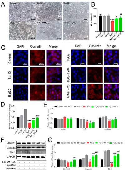 To investigate the cytotoxicity of Bai on IPEC-J2 cells, the cell viability was tested by CCK-8 assays, and the morphological changes of IPEC-J2 cells were observed by optical microscopy. As shown in Figure 1A,B, the viability of IPEC-J2 cells treated with H2O2 was significantly decreased compared with control group (0 μM H2O2). However, pretreatment of IPEC-J2 cells with Bai significantly improved cell viability in the presence of H2O2 in a dose-dependent manner, which was consistent with morphological change by light microscope observation. To further determinate the effects of Bai on H2O2-induced barrier function damage in IPEC-J2 cells, we detected the TJ protein expression (Figure 1E,G). Compared with the control group, the mRNA abundance of ZO-1 and Occludin was significantly decreased in the H2O2-treated group. Pretreating with Bai reversed this downregulation of Occludin induced by H2O2 (p < 0.05). The protein expression of Claudin-1, ZO-1, and Occludin was decreased in the H2O2-treated group compared with the control group, while the addition of Bai can effectively alleviate this decline. In addition, immunofluorescence results of Occludin were consistent with TJ protein expression (Figure 1C,D).