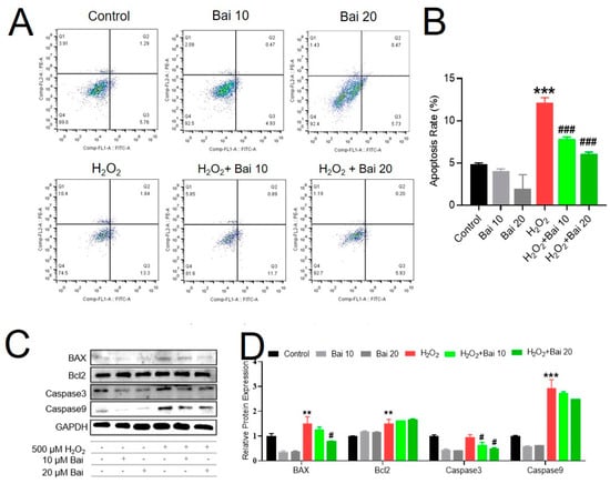 Figure 2. The protective effects of Bai on apoptosis in H2O2-induced IPEC-J2 cells. IPEC-J2 cells were pretreated with the indicated concentrations of Bai and then cocultured with 500 μM H2O2 for 4 h. (A,B) Apoptosis cells were analyzed by flow cytometry; results are presented as the percentage of cell viability; values are the mean ± SD. (C,D) Levels of apoptosis-related proteins. “*” indicates a significant difference compared with the control group (** p < 0.01 and *** p < 0.001). “#” indicates a significant difference compared with the H2O2 group (# p < 0.05 and ### p < 0.001).