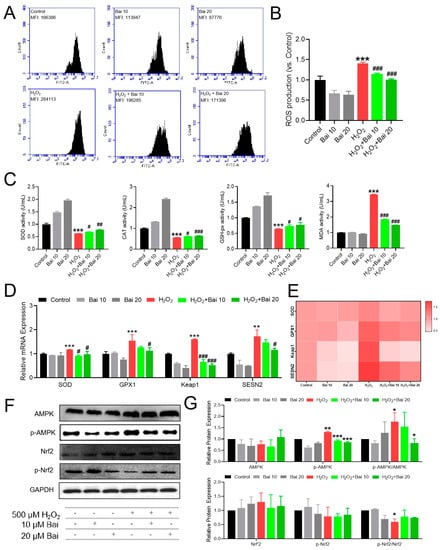 To confirm whether H2O2-induced oxidative stress was attenuated by Bai increasing the antioxidant enzyme activities, the intracellular ROS level and activation of antioxidant capacity were detected in IPEC-J2 cells. Compared with the control group, the intracellular ROS level increased significantly in the H2O2-treated group, whereas Bai reversed the H2O2-induced upregulation of ROS level (p < 0.01) (Figure 3A,B). The increase in intracellular ROS level depends on the breakdown of oxidative balance. As shown in Figure 3C, the antioxidant enzyme activities of SOD, CAT, and GSH-px were significantly decreased, and the lipid peroxidation products (MDA) were significantly increased in the H2O2-treated group, while pretreatment with Bai in a dose-dependent manner significantly increased SOD, CAT, and GSH-px activation and decreased MDA activation induced by H2O2 (p < 0.05 or p < 0.001). Antioxidant gene expression was regulated by the AMPK/Nrf2 signaling pathway. As shown in Figure 3D,E, the antioxidant-related genes SOD, GPX1, Keap1, and SESN2 were significantly increased in the H2O2-treated group, while pretreatment with Bai significantly reversed this upregulation of SOD, GPX1, Keap1, and SESN2 induced by H2O2 (p < 0.001 or p < 0.05). In addition, H2O2 increased the ratio of p-AMPK/AMPK and decreased the ratio of p-Nrf2/Nrf2 compared with the control group, which was reversed with the addition of Bai (p < 0.05) (Figure 3F,G).