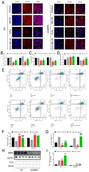 Figure 4. Effects of Bai on the H2O2-induced intestinal barrier and apoptosis in AMPK-knockdown IPEC-J2 cells. The AMPK-knockdown (shAMPK-IPEC-J2) and/or control (SC-IPEC-J2) cells were pretreated with or without 20 μM Bai for 12 h and then cocultured with 500 μM H2O2 for 4 h. (A,B) Immunofluorescence was observed in the sections stained for Occludin under different groups and conditions. Scale bar, 10 μm. (C) CCK8 reagent measured the viability of IPEC-J2 cells. (D) The mRNA levels of Claudin1 gene expression. (E,F) Apoptotic cells were analyzed by flow cytometry; results are presented as the percentage of cell viability; values are the mean ± SD. (G) The mRNA levels of Bcl2/Bax genes in IPEC-J2 cells under different treatments. Data are shown as ratios of abundance of target gene transcripts in the treated cells to those in the control cells after normalization to β-actin. (H,I) Protein levels of AMPK were detected by Western blot with GAPDH as the loading control. “*” indicates a significant difference compared with the control group (* p < 0.05, ** p < 0.01, and *** p < 0.001). “#” indicates a significant difference compared with the H2O2 group (# p < 0.05, ## p < 0.01, and ### p < 0.001).