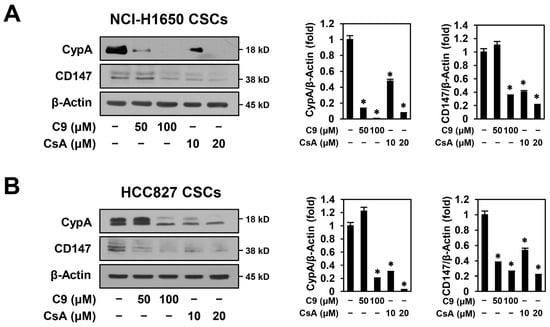 The CypA/CD147 axis plays a crucial role in CSC initiation, growth, maintenance, and metastasis [14]. Thus, we investigated whether C9 and CsA affected the expression of CypA and CD147 in NSCLC CSCs. As shown in Figure 5A,B, the expression levels of CypA and CD147 were reduced by treatment with C9 or CsA in a dose-dependent manner in NCI-H1650- and HCC827-derived CSCs, implying that the anticancer activities of C9 and CsA on NSCLC CSCs resulted from the downregulation of the CypA/CD147 axis.