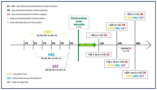 Graphical flowchart providing an overview of the study. Groups S1, S2, and S3 consisted of animals without minocycline administration; the time elapsed between ischemic stroke induction and euthanasia was equal to 12 h, 24 h, and 48 h, respectively. Groups S1 + m, S2 + m, S3 + m included animals with minocycline administration; the time elapsed between ischemic stroke induction and euthanasia (DX) was equal to 12 h, 24 h, and 48 h, respectively. In order to verify the effect of minocycline administration on the level of motility after stroke induction, the following motor tests were also performed on the animals: CatWalk™ XT (CWT), Grip Strength test (GST), and the Horizontal Runway Elevated (HRE) test.