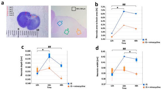 Infarct formation was already well advanced at 12 h (S1 and S1 + m groups) after the induction of the photothrombotic stroke, as evidenced by the increase in the volume of the “necrosis area to brain area” (Figure 2b). The infarct volume reached its maximum after 24 h (S2 and S2 + m groups); then, the infarction volume decreased significantly on the second day (S3 and S3 + m groups). Statistical analysis revealed significant differences (the Mann Whitney U test, p = 0.008) in all tested variables, including “necrosis area to brain area”, “necrosis width”, and “necrosis depth” at each time interval between the groups without administration of minocycline (S1, S2 and S3) and with administration of minocycline (S1 + m, S2 + m and S3 + m). The greatest decrease in infarct volume was observed between the S2 and S2 + m groups, where the administration of minocycline resulted in an average decrease of 0.8% in the volume of the infarcted area compared to the group without the administration of minocycline (Figure 2b).